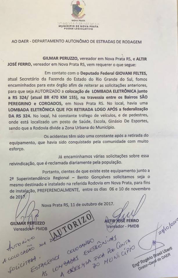 Os vereadores Altir José Ferro e Gilmar Peruzzo conseguiram a autorização do diretor-geral do Daer, Rogério Uberti, para a instalação da lombada eletrônica na BR 470, na travessia entre os bairros São Pelegrino e Coroados, em Nova Prata. A busca pela reinstalação das lombadas é antiga, tendo começando logo após o desligamento das lombadas anteriores. Os vereadores conferiram a existência de duas lombadas na superintendência do Daer em Bento Gonçalves e conseguiram a autorização para instalação das mesmas. Conforme acordado com o Daer, o município deverá fornecer energia para a instalação, pedido este que já está aprovado. Uberti autorizou que o equipamento seja instalado já nesta semana, entre os dias 06 e 10 de novembro.